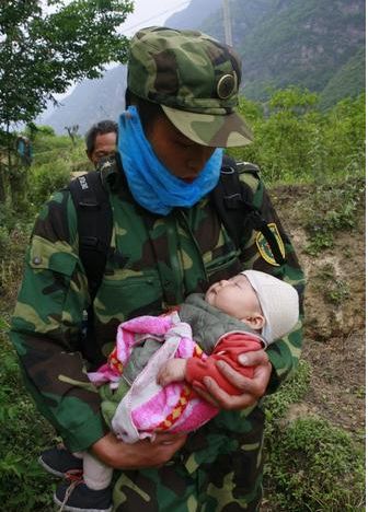 抢救人员发现她的时候,她已经死了,是被垮塌下来的房子压死的,透过那一堆废墟的的间隙可以看到她死亡的姿势,双膝跪著,整个上身向前匍匐著,双手扶著地支撑著身体,有些象古人行跪拜礼,只是身体被压的变形了,看上去有些诡异。救援人员从废墟的空隙伸手进去确认了她已经死亡,又在冲著废墟喊了几声,用撬棍在在砖头上敲了几下,里面没有任何回应。当人群走到下一个建筑物的时候,救援队长忽然往回跑,边跑变喊“快过来”。他又来到她的尸体前,费力的把手伸进女人的身子底下摸索,他摸了几下高声的喊“有人,有个孩子 ,还活著”。 经过一番努力,人们小心的把挡著她的废墟清理开,在她的身体下面躺著她的孩子,包在一个红色带黄花的小被子里,大概有3、4个月大,因为母亲身体庇护著,他毫发未伤,抱出来的时候,他还安静的睡著,他熟睡的脸让所有在场的人感到很温暖。 随行的医生过来解开被子准备做些检查,发现有一部手机塞在被子里,医生下意识的看了下手机屏幕,发现屏幕上是一条已经写好的短信“亲爱的宝贝,如果你能活著,一定要记住我爱你”,看惯了生离死别的医生却在这一刻落泪了,手机传递著,每个看到短信的人都落泪了。