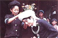进寨后,不把姑娘领进家,而由陪娘陪着住在别家。第二天日出时,陪娘陪着新娘来新郎家。身挎长刀,喜气洋洋的小伙子立刻拔出长刀,一边“砍”金竹拱门(长刀尖轻轻搭到金竹拱门上),一边用刀尖比划着姑娘的后脑壳。用长刀“砍”金竹拱门的意思是开新路,用刀尖比划姑娘的后脑壳表示驱邪。进到堂屋里,上伙子收起长刀挂在墙上,金竹扎的拱门抬进新房放在床头,象征着爱情象金竹永远长青。接着双双拜堂成亲。然后陪娘把新娘领进灶房,拿出包袱里的东西把姑娘打扮成新媳妇。接着新媳妇到井里挑一担水,新郎在大门口接过新媳妇的水挑进家里,看热闹的人祝福小俩口象水一样纯洁,恩爱幸福。结婚仪式结束,男方的客人快来时,新娘到半路迎接,到离家一公里处,众客人坐下不走了。新娘说:“辛苦了,请到家里坐!”众姑娘回答:“你倒好意思说,姐夫都不请我们,你家在哪里我们都晓不得,咋好意思去!”这时新郎在小伙子簇拥下来到了。小伙子们先开口:“请到家里坐!”姑娘们不买帐:“姐夫都不叫,你们喊有什么用!”新郎只得上前弯腰作揖,请姑娘们到家里坐。姑娘们走五、六公尺又不走了;新郎只得作揖再请,如此三十多次才把这些人请进家。新娘的女伴把大饭盒里的鸡肉和饭装在碗里,由“贺哨”(姑娘们的领头)给小俩口吃,希望他俩同甘共苦。吃到快饱时,寨里的小伙子进来把门堂屋门关紧,端着饭菜,唱着山歌,请姑娘们吃一碗: