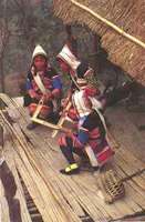 竹楼屋脊两头装饰着茅草扎的耳环花,一般群众的竹楼共饰六朵,即每边屋脊顶端一朵,两个斜边各一朵(图1);村寨“七老”家(即卓生、卓巴、生努、巴努、扣普楼、乃厄、达在)则饰十朵,即每边屋脊顶端一朵,两条斜边各两朵(图2)。装饰着耳环花的竹楼不仅可以使人识别出其主人的社会地位和身份,而且使人联想翩跹。如果你从稍远的地方注视着竹楼侧面,那饰着花朵的三角形竹笆山墙,恰似一个头戴三角形帽子的基诺族妇女头像,耳孔里插着芳香的鲜花,端庄静穆地凝视着远方。