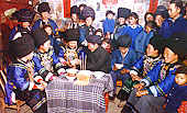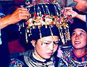 或用豆渣和荨麻叶对娶亲人围攻,打得娶亲人遍体都是豆渣;荨麻叶蜇得娶亲火焦辣疼,叫“打亲”“打发”,既越打越亲,越打越发。要女方待老年人出来制止才停。然后,晚上男女青年可以对唱山歌,通宵达。结婚日叫做“正日”,正日黎明,开始发亲,由女方送亲大哥[兄弟]背新娘从正门出换新鞋送入户门外的花轿中,抬去男家。若途中与别寨娶亲队伍相遇,则各抢先从高处绕过。到了男家门外就由娶亲大哥背新娘从门前火盆上走过,然后新郎新娘行礼拜堂,男方则大摆宴席三天,答谢亲朋好友等不在话下,过完三早后新郎陪新娘回娘家探亲小住几天。