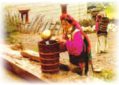 殷勤礼貌、热情好客是普米族的传统美德。大年初一这天,他们会到村口争相邀请素不相识的过路人到家里作客,由于大家都把能请到客人当作是一件吉祥快乐的好事,有时候会因为来往的行人少,就出现了几家争抢一个客人的热烈埸面……