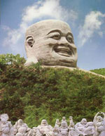 露天大佛 山是一尊佛,佛是一座山。在盘虎岩对面华严庵右侧,有一座20米高的小山,山体宛如大佛的身躯,两膝端坐,袒胸露腹,自然形态毕肖。设计者巧妙地人工加装一高10米弥勒头像,使一尊头顶蓝天、笑口常开,高30米的露天弥勒呈现在盘虎岩峡谷中,憨态可掬。露天弥勒下,还置有6尊小石雕弥勒,惟妙惟肖,相映成趣,相得益彰。