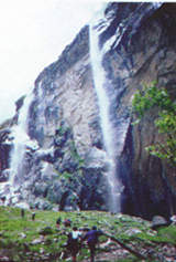 卡格博峰南侧,有瀑布自千米悬崖倾泻而下,称“雨崩神瀑”。每年夏季冰雪消融,一股股水流沿崖壁飞泻,像千万匹白练飘然而下,飘飘洒洒,十分壮观。若逢阳光返照,云雾蒸腾,便有彩虹出现,美如天上仙境。
