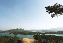万绿湖与浙江的千岛湖同是以浩瀚的湖水、青翠的群岛构成风景资源的主体,称得上是一对“姐妹湖”。两湖均是人工湖,同于公元1958年开工建设,有“华南新丰江、华东新安江”之说,同样具有发电、防洪、供水功能。新安江水库湖面面积580平方公里,总容量178亿立方米,因有1078个岛屿而得名千岛湖;新丰江水库湖面面积370平方公里,总容量139亿立方米,因四季皆绿、处处是绿而取名万绿湖。干岛湖地处黄山与杭州的黄金旅游线上,而万绿湖距广州、深圳均在200公里以内,堪称是珠江三角洲的“后花园”。千岛湖的山多为石山,万绿湖的山多为土山;千岛湖 冬季寒冷、湖面有雾,万绿湖四季如春,水上娱乐时间长;千岛湖区内工业产值达6O个亿,万绿湖区内工业产值几乎为零,生态环境良好。早在公元1983年,千岛湖便开始旅游业,现在年入湖游客己达上百万,万绿湖的正式开发在公元1995年.起步较晚,但起点较高。当地政府在景区树起了绿色文化的大旗,以绿色邀请人们、陶醉人们和馈赠人们,目标是在下世纪初把万绿湖建设成为具有国际知名度的生态旅游观光名胜。