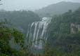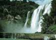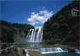 黄果树瀑布落差74米,宽81米,河水从断崖顶端凌空飞流而下,倾入崖下的犀牛潭中,势如翻江倒海。水石相激,发出震天巨响,腾起一片烟雾,迷蒙细雾在阳光照射下,又化作一道道彩虹,幻景绰绰,奇妙无穷。瀑布对岸高崖上的观瀑亭上有对联曰:“白水如棉不用弓弹花自散,虹霞似锦何须梭织天生成”,此乃是黄果树瀑布的生动写照。但黄果树瀑布的形态因季节而有变化,冬天水小时,它妩媚秀丽,轻轻下泻;到了夏秋,水量大增,那撼天动地的磅礴气势,简直令人惊心动魄。有时瀑布激起的雪沫烟雾,高达数百米,漫天浮游,竟使其周围经常处于纷飞的细雨之中。