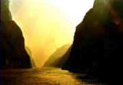 走得累了,便找块岩石坐下,欣赏起周围的景色,而这时只有悬崖边的电线杆默默地陪着我。四周“两岸连山,略无阙处“ 山峰陡峭笔直,人迹罕至,居然连鸟叫也很少听到。唯有滔滔江水不绝于耳,此时的长江尤如一条黄色的巨龙,蜿蜒在崇山峻岭之中,又似一阙壮丽却不失柔美的交响乐,奏响于天地之间。我被无边的美景包围着,沉醉了,神飞天外。不知过了多少时候,好象隐隐听到人声,心中不免一惊,因为出发前听说前不久有三女一男被劫。可是过了一会儿却又听不见了,以为自己听错了,美梦已醒,于是起身赶路。刚转过一道山梁,蓦见两位山民各填着一头大黄牛迎面走来,一见我他们忙示意我往山上躲,待我爬上一块突出的岩石,牛己到了眼前,虽然山路十分难行,两只牛行却是悠然自得。一边走一边还东一口西一口啃着草。别过山民继续赶路,路越来越难行,全被荒草覆盖,只能用双脚在草下摸索,好在还可从草的长势中分出方向。突然左小腿一陈刺痛,大惊,以为被蛇咬了一口,拔出脚时,一只大野蜂嗡地一下飞走了。被咬的地方慢慢地肿起一大块。还好只是虚惊一场。待疼痛稍减,继续赶路。此时太阳已落在山后,从中午算起,短短4公里山路已走了三个多小时,可见山路的难行,而最难行的还在前面即将出峡的一段,此地全是裸露的岩石,今年长江上游大雨又使山体发生了大面积滑坡,七十度的山坡约有一百米全被大大小小的碎石覆盖,真不知两头牛是怎么过来的。束紧背囊,双手撑住山壁,手脚并用,一步步往前挪,脚底不时有碎石滚落江中,到了地势稍缓处,方可换口气,休息一下,不知不觉中背上已是汗涔涔了。不禁感叹森林植被被破坏之严重,“两岸猿声啼不住”早已不知是猴年马月的事了。 过了险段,到信号台大溪古镇已在眼前了,回眸来路,望着奔腾不息的长江,心中涌起一股无名的热流。是啊,只有亲身经历了祖国的山山水,才能真正体验到祖国的可爱之处。大溪古镇在江对岸,江边长满了桔树,果实累累,伸手可及。原来此地也是柑橘的产地。大溪是个小镇,一条大街宽两米,走一圈也就十分钟。我住在一户人家开的小店,条件十分简陋。但从窗口可眺望瞿塘峡的入口和对岸大溪古人类遗址。晚上睡在长江边上,听着江滔声和汽笛声,感觉非常幸福。早上起床后,店主让他的儿子带我到山里边走走,我们先沿着古镇边的长江支流往上走,两边的农舍大都用泥巴垒成,生活比较艰苦。而且两边山上滑坡现象十分严重。然后又去看了看新建的移民新村,条件比原来要好多了,祝愿他们的生活一天比一天好。下午有一班船到巫山,与他们一起吃了午饭,才恋恋不舍告别相处了两天的人们,继续我的行程。